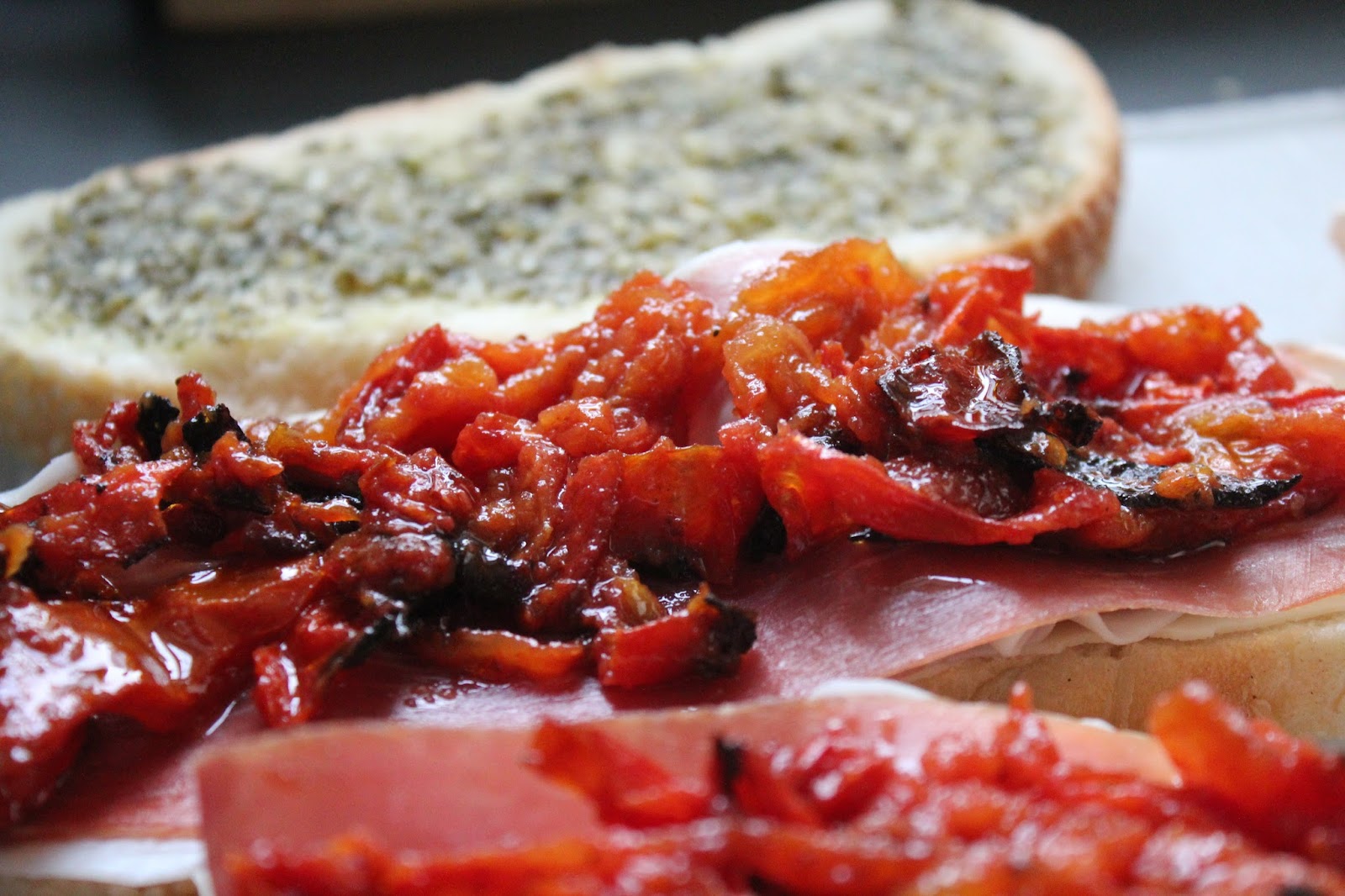 After tasting the cheese, I thought about components that would work well with it and ended up assembling a sandwich on scali bread with basil pesto, speck, and roasted tomatoes. The basil pesto provided bright herby flavor while the speck added a touch of smokiness and the roasted tomatoes some sweetness. I brushed the scali bread with olive oil to stick with the Italian theme and grilled the sandwich until it got nice and toasty and the cheese got gooey and melty. Then I halved the sandwich and took a bite. I was so happy with how all the flavors played off of each other.